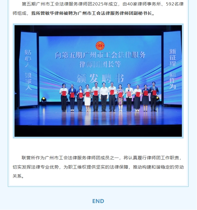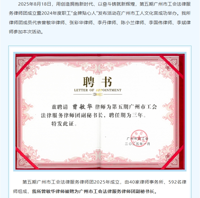 金桥司徒邝喜讯|我所曾敏华律师受聘为广州市工会法律服务律师团副秘书长