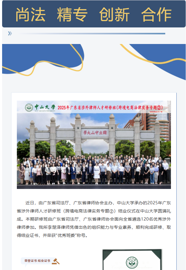 喜讯 | 我所李楚泽律师参加广东省涉外律师人才研修班 并获评“优秀班委”
