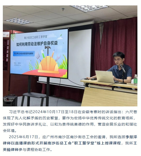 金桥司徒邝动态|我所李楚泽律师受邀南沙街总工会开展“职工慧学堂”线上授课