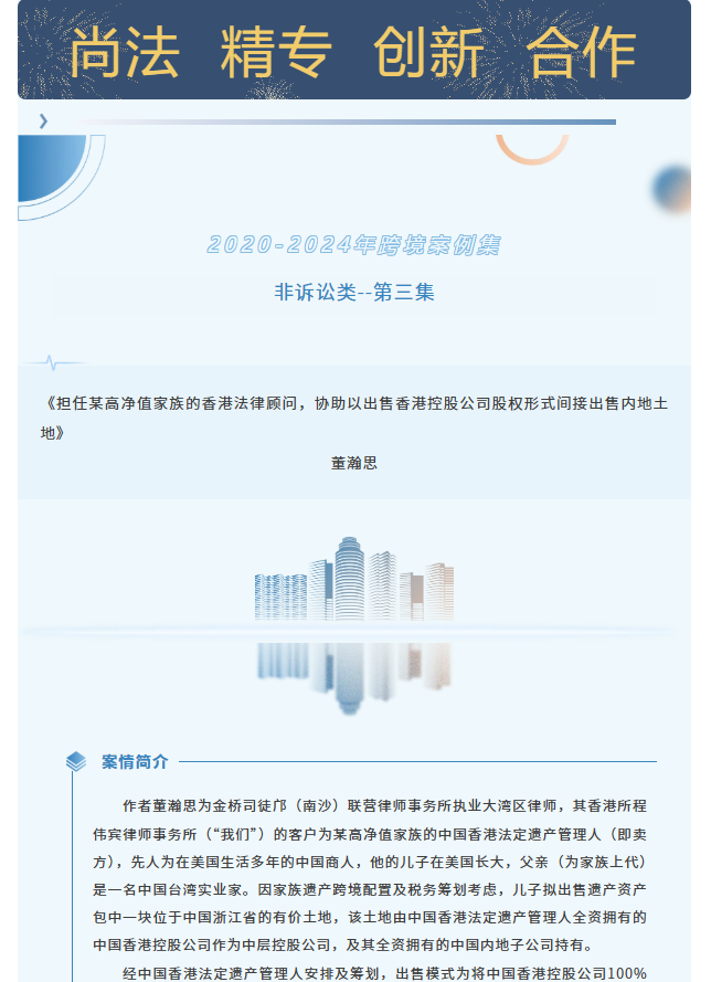 KSK跨境案例|《担任某高净值家族的香港法律顾问,协助以出售香港控股公司股权形式间接出售内地土地》