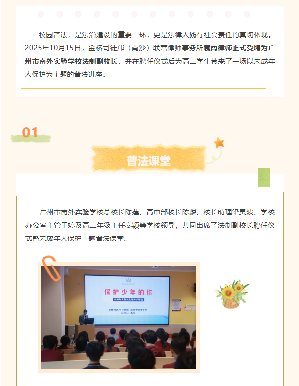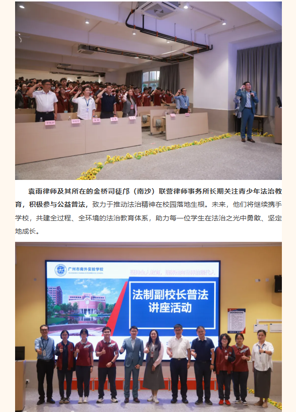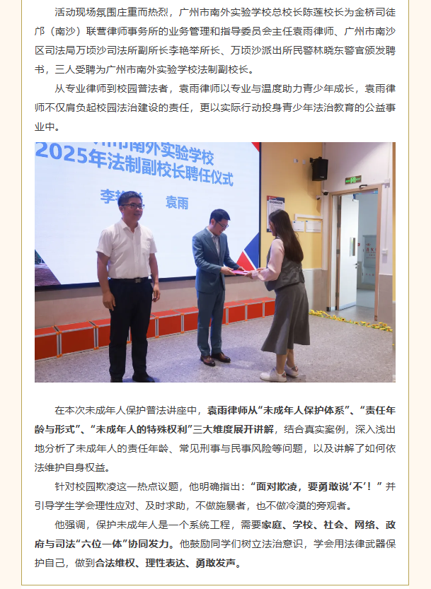 公益|袁雨律师受聘为广州市南外实验学校法制副校长并开展未成年人保护讲座