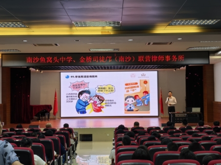 2025年9月9日下午,由南沙区司法局东涌司法所、南沙区人民法院东涌人民法庭和南沙鱼窝头中学为主办单位,南沙区妇联、东涌镇平安法治办、东涌镇党群服务中心〔劳动保障组〕、东涌镇妇联、东涌镇团委、东涌镇道安办和金桥司徒邝(南沙)联营律师事务所(以下简称“我所”)为协办单位,在鱼窝头中学阶梯室及门前广场开展“与法同行 护航青春”未成年人保护主题宣传活动。