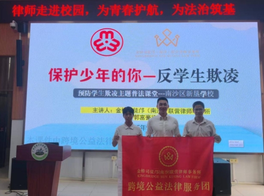 为了增强学生对校园欺凌的认识,营造一个安全、和谐、阳光的校园环境,2025年9月18日,金桥司徒邝(南沙)联营律师事务所(下称我所)跨境公益法律服务团(下称公益团)郭富豪律师、李国伟律师、梁家俊律师接受新垦学校的邀请,为刚刚入学的130多名初一学生送上一堂别开生面的开学第一课——反学生欺凌普法讲座。