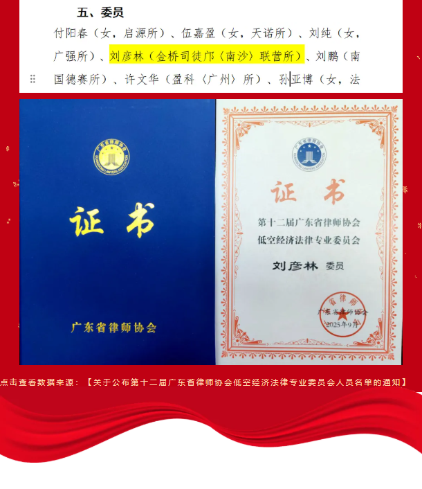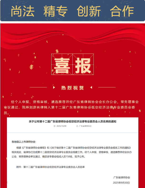 祝贺┃我所刘彦林律师成功入选第十二届广东省律师协会低空经济法律专业委员会委员