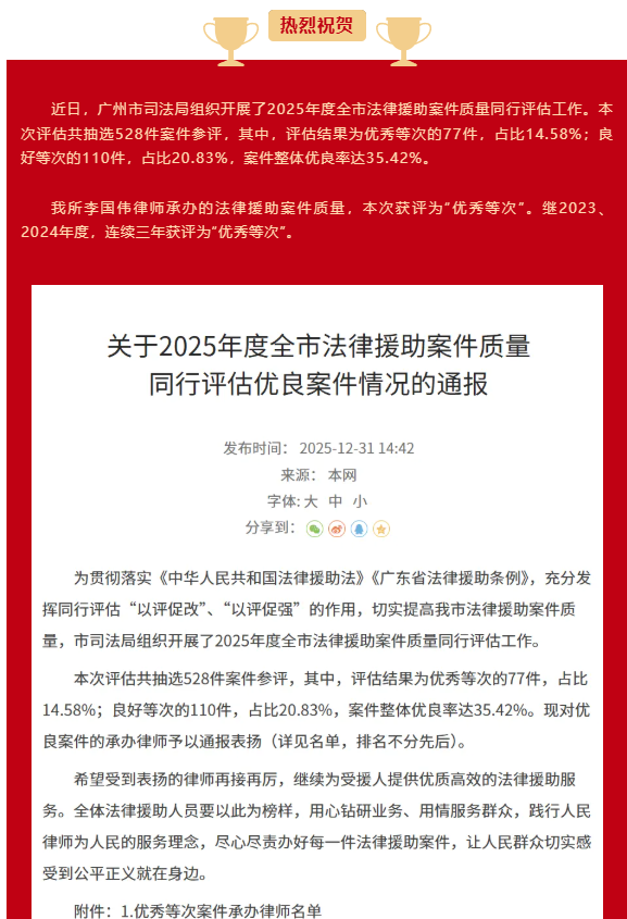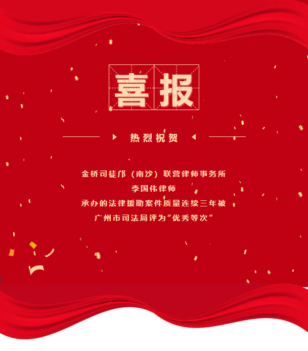 喜讯|祝贺李国伟律师承办的法律援助案件质量连续三年被广州市司法局评为“优秀等次”