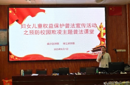 为了增强学生对校园欺凌的认识,营造一个安全、和谐、阳光的校园环境,2025年8月7日,金桥司徒邝(南沙)联营律师事务所(以下简称“我所”)跨境公益法律服务团(简称“公益团”)曹盼律师、梁家俊律师接受南沙区妇联、珠江街妇联、珠江街“双百”社工站的邀请,到珠江街嘉安小学为20多名同学送上一堂别开生面的反校园欺凌普法讲座。