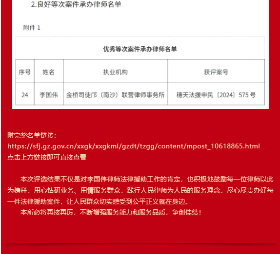 喜讯|祝贺李国伟律师承办的法律援助案件质量连续三年被广州市司法局评为“优秀等次”