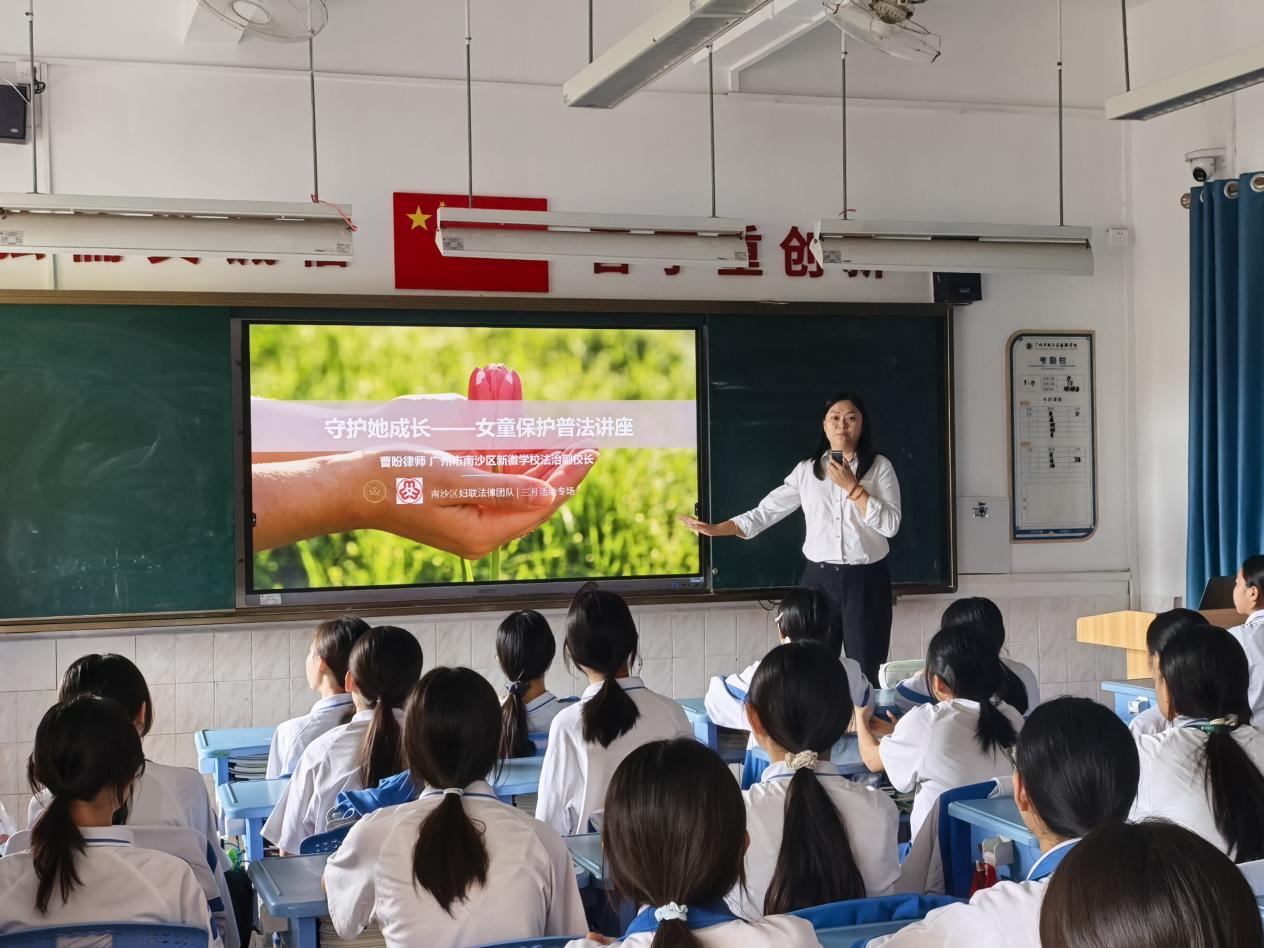 为南沙区新徽学校约60多名女同学开展“守护她成长—女童保护”法治教育讲座。梁家俊律师参与协助本次讲座举行。